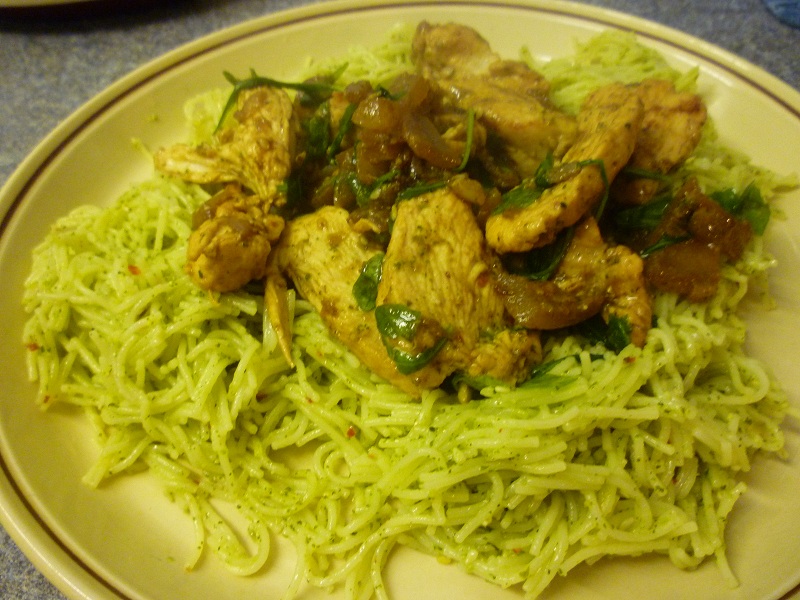 I just cooked the chicken in a wok with some onions and added a small amount of chilli pesto and some salad leaves (for greenery, I'm nothing if not aesthetic), then served with some re-hydrated rice noodles which had more of the chilli pesto stirred through.